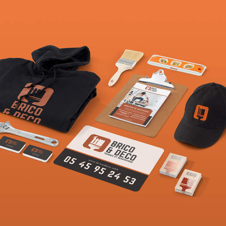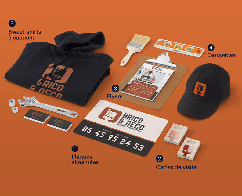 Au-delà des coloris de votre logo, vous pouvez créer des plaques aimantées ou des flyers ornés de couleurs contrastantes pour qu’ils soient visibles de loin. L’entreprise BRICO & DÉCO a opté pour l’alliance du blanc cassé, du noir et de riches nuances orangées : cette association crée un effet bicolore qui ressort sur les différents supports, de près comme de loin. En plus d’être esthétique et visible même à une certaine distance, la palette de couleurs choisie par BRICO & DÉCO reflète parfaitement l’entreprise : la couleur principale est un orange rappelant la teinte de la rouille, qui évoque efficacité et fiabilité. Cet effet est renforcé par l’association de l’orange et des couleurs classiques que sont le noir et le blanc. Pour rehausser ses casquettes et polos noirs, BRICO & DÉCO a fait broder son logo dans une teinte orange plus soutenue afin d’en accentuer le contraste et la visibilité.