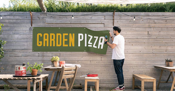 Garden Pizza a ensuite investi dans une grande banderole en vinyle. « Nous avons accroché des banderoles à l’extérieur pour aider nos clients à nous trouver, car notre restaurant n’est pas comme les autres : c’est plutôt comme entrer dans un jardin. »