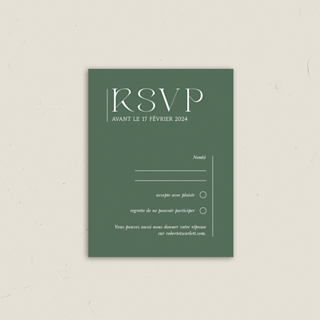 Un assortiment de mariage classique comprend une carte « save the date », un faire-part de mariage et une carte de réponse ou un carton d’accompagnement. Si vous souhaitez donner à vos invités la possibilité de confirmer leur présence de façon numérique, ajoutez un code QR sur votre invitation pour les renvoyer directement au site Internet de votre mariage.
