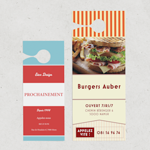 Vous vous lancez dans la création ? Commencez par parcourir notre sélection de modèles déclinés dans différents thèmes et couleurs. Nous proposons deux formats d’accroche-porte : petit format (89 x 216 mm) et grand format (114 x 279 mm). Vous pouvez créer le vôtre de toutes pièces en le personnalisant au gré de vos envies, avec toutes les informations que vous voulez. Si vous ne trouvez pas de graphisme à votre goût, vous pouvez télécharger le vôtre ou faire appel à l’un de nos graphistes qui en créera un pour vous. Une fois que le résultat vous satisfait, vous nous passez le relais. Vos accroche-porte seront soigneusement imprimés en couleur et livrés chez vous, prêts à se mettre au travail.