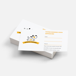Nous savons à quel point il est important de créer des relations solides avec vos clients. Et parfois, ce sont les petits détails qui font la différence. Nos cartes de rendez-vous personnalisées sont une solution pratique qui permettra à vos clients et vos patients de ne plus jamais oublier un rendez-vous, tout en mettant en valeur les informations de votre entreprise. Que ce soit pour un cabinet médical ou vétérinaire, un institut de beauté, un spa, une concession automobile ou des services à domicile, offrez à vos clients ou à vos patients une solution pratique qui les aidera à rester bien organisés.La commodité à portée de main