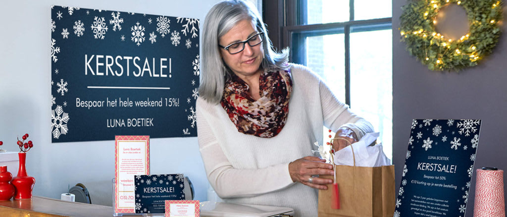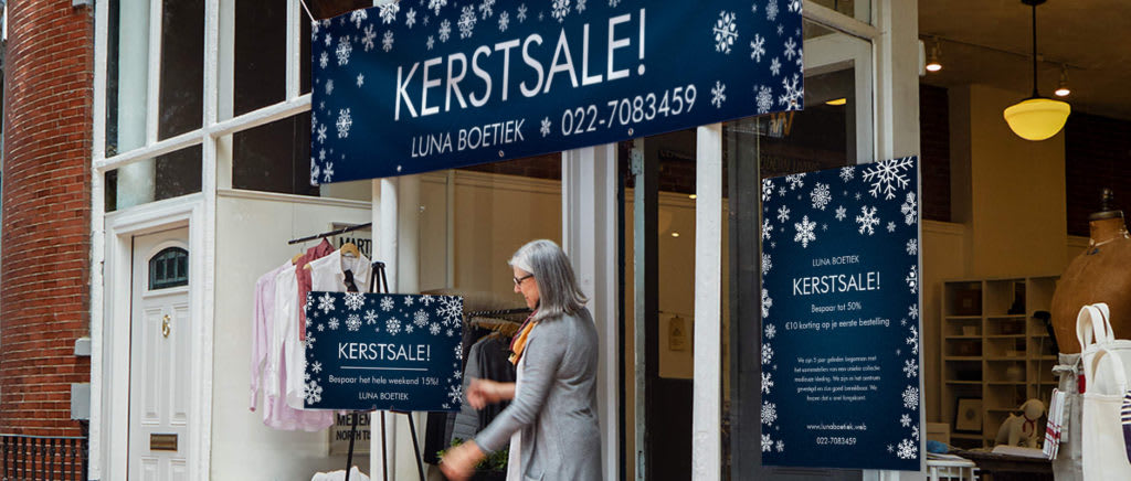 - Hang posters en spandoeken op. Kondig je sale aan en trek potentiële en bestaande klanten aan die langslopen en rondkijken.